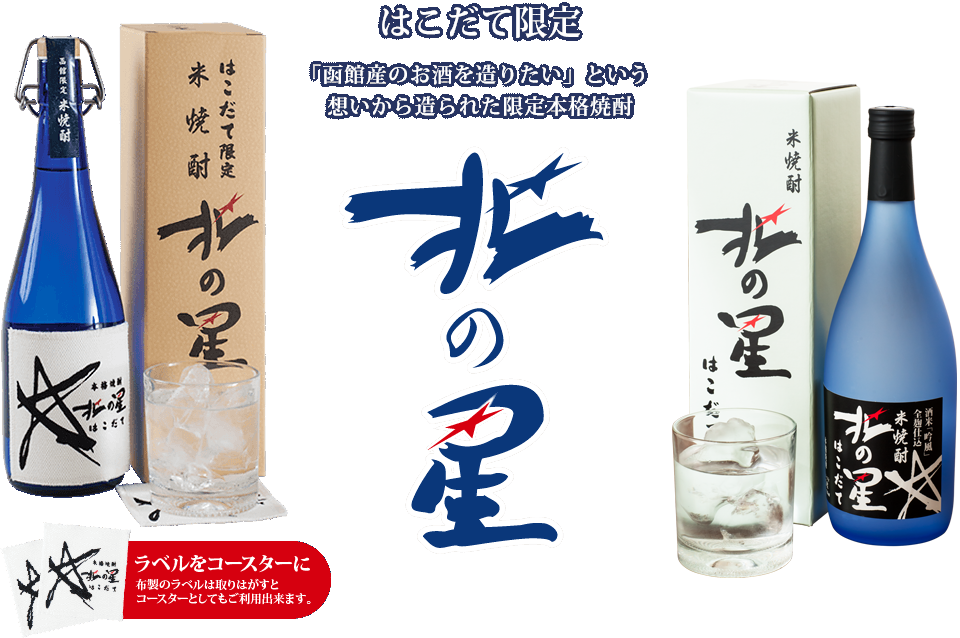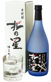 函館限定米焼酎 【北の星】 は、函館地区産の酒米 『吟風』 を使用し、日本酒などで用いられる黄麹を使った全麹仕込みが特徴です。アルコール分を函館の緯度に合わせ41度に仕上げた 【北の星 41】 と、アルコール 度数を25度に抑えた 【北の星 25】 をご用意しており、どちらもフルーティーでまろやかな味わいが特徴で、オンザロックでも水割りやお湯割りでもおいしくお飲みいただける優しく香り豊かな本格米焼酎です。